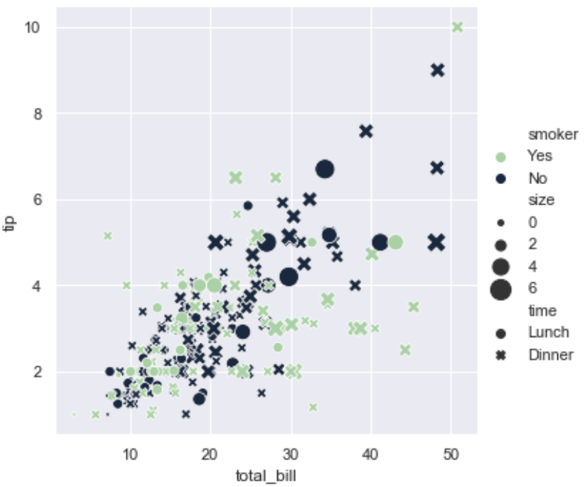 sns.relplot(x="total_bill", y="tip", size="size",hue="smoker", palette="ch:r=-.5,l=.75", style="time",sizes=(15, 200), data=tips);scatterplot是relplot的默认方法所以不需要单独设置,具体属性可以去scatterplot()的Api查看.