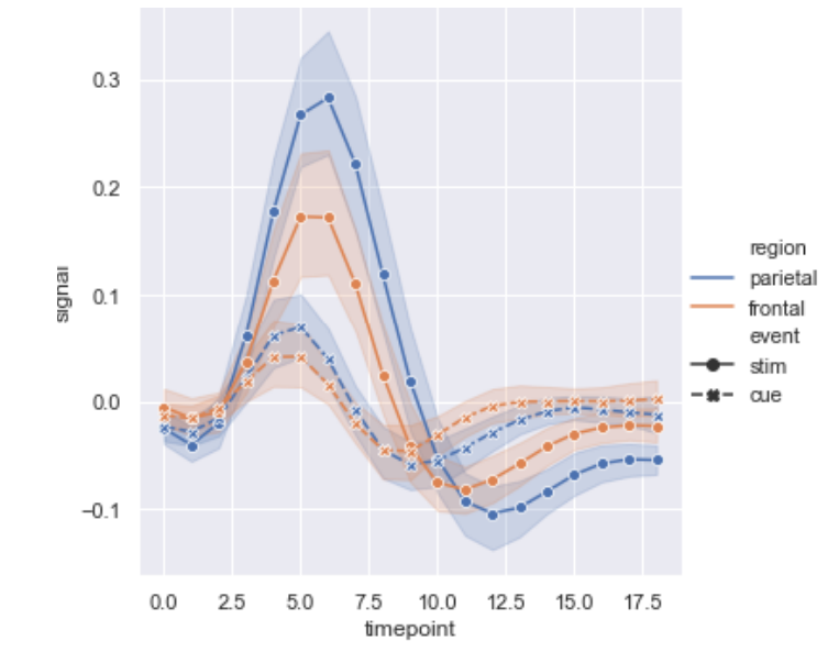 接下来我们使用seaborn最常用的方法relplot()实现散点图scatterplot()和线图lineplot()