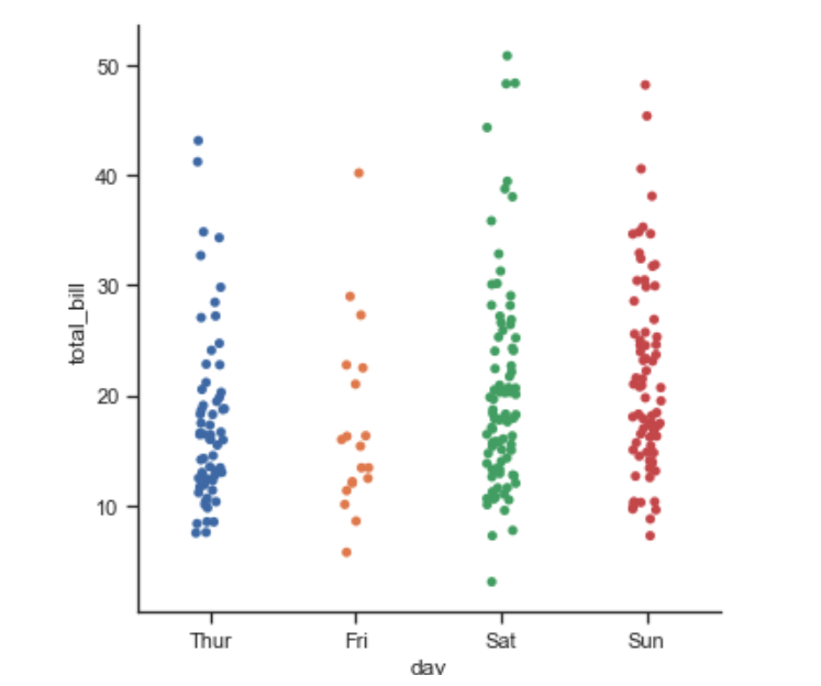 sns.catplot(x="day", y="total_bill", data=tips); 可以发现上面有些数据重叠在一起了,解决这个问题可以使用jitter属性,也可使用另一种散点图swarm,它自动使用算法区分出可能重叠的数据.需要注意的是可以使用order来控制顺序.下面的例子可以看出