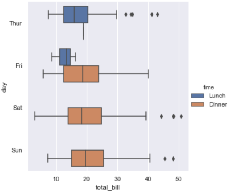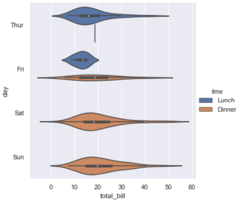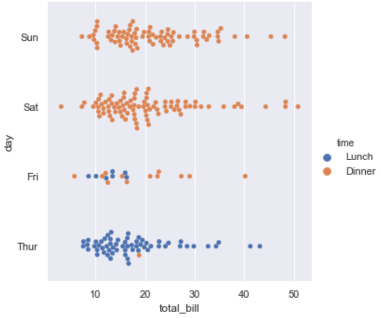 sns.catplot(x="total_bill", y="day", hue="time", kind="swarm", order=["Sun", "Sat","Fri","Thur"], data=tips);分布图 Distributions of observations within categories