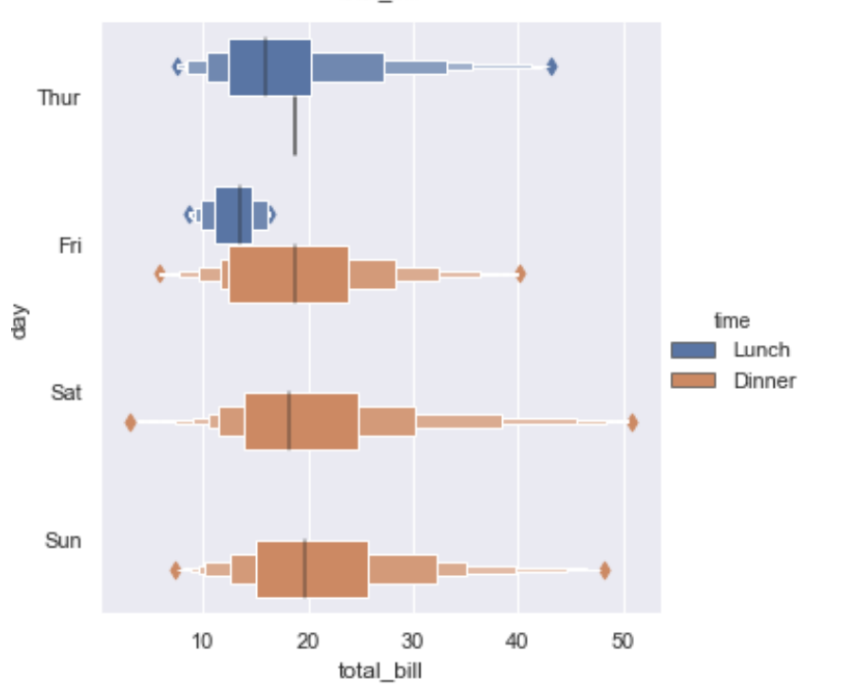 数据量太大的时候,散点图显示不同种类的分布情况非常恐怖,所以可以使用分布图来观察不同种类数据的分布情况,具体代码就不贴了,只需要更改一下kind属性就可以了,下面分别看一下box,boxen,violin三种情况不同的显示风格:
