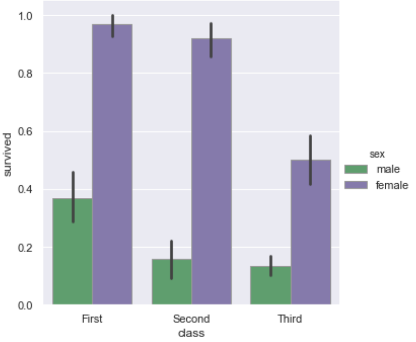 titanic = sns.load_dataset("titanic")首先下面看一下柱状图,这张图是可以直观的比较出各个仓位的生存率,需要指出的是柱状图的矩形边框也可以设置颜色.
